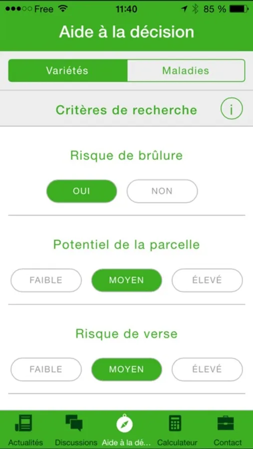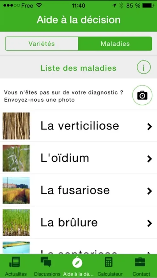 - Espace aide à la décision qui regroupe une aide au choix variétal et une description des principales maladies. L'utilisateur a la possibilité d'envoyer des photos pour affiner son diagnostic