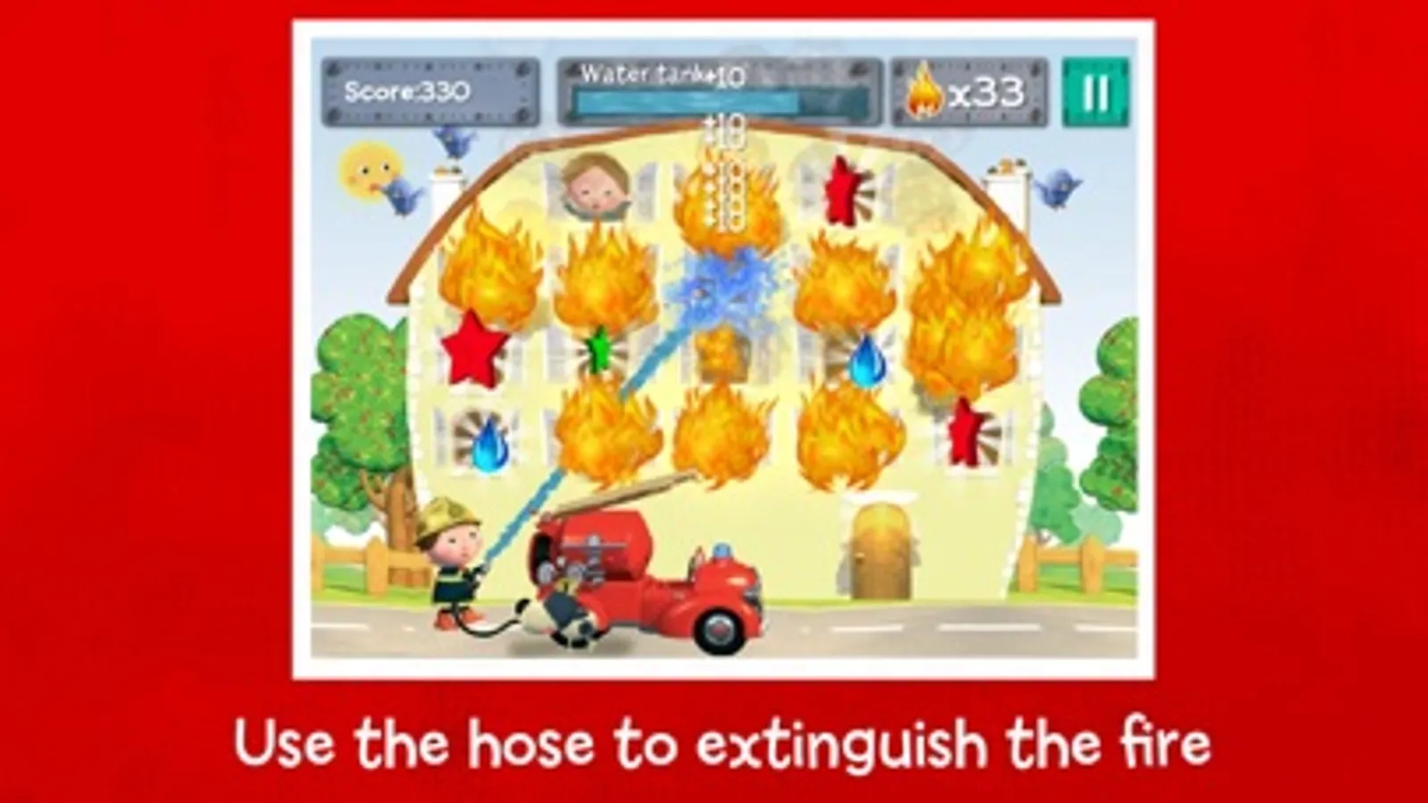 ¤ "Fire! Fire!" Use the hose to extinguish the burning house.