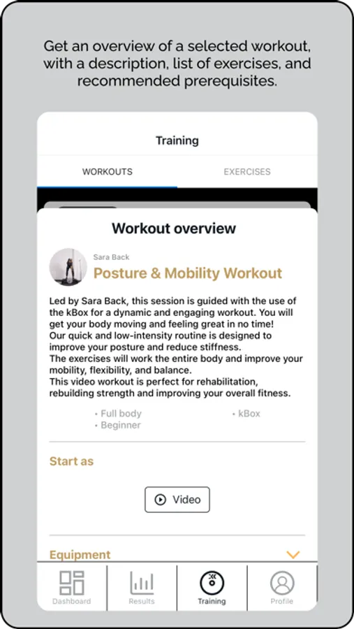 The app also allows users to view workout content in the form of videos to be used as a guide during training, or simply as inspiration. Some of the workouts can also be followed step by step, which allows for simultaneously connecting to a kMeter and registering data during the workout.