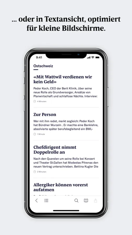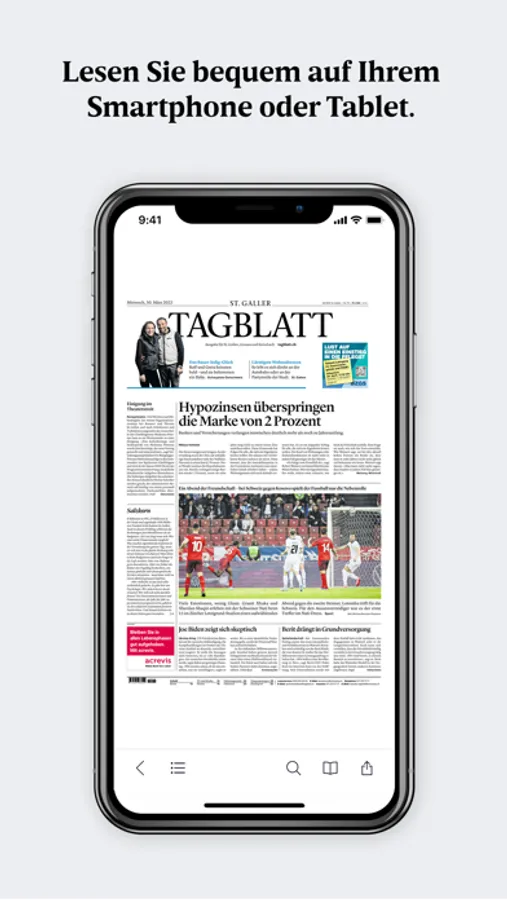 Das E-Paper ermöglicht Ihnen das Lesen wahlweise im Zeitungslayout oder in der mobilen Leseansicht auf Ihrem iPhone und iPad. Durch einfaches Antippen wechseln Sie die optimierte Darstellung für verschiedene Bildschirmgrössen.