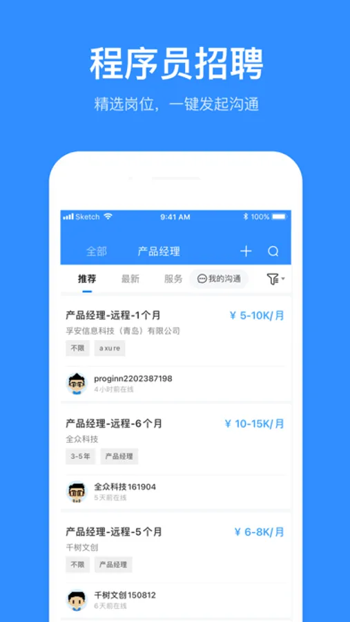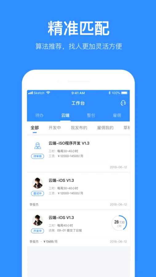 -- 项目方可通过我们找到全国各地各类BAT级人才。所有签约开发者均经过严格身份、经验与作品认证。