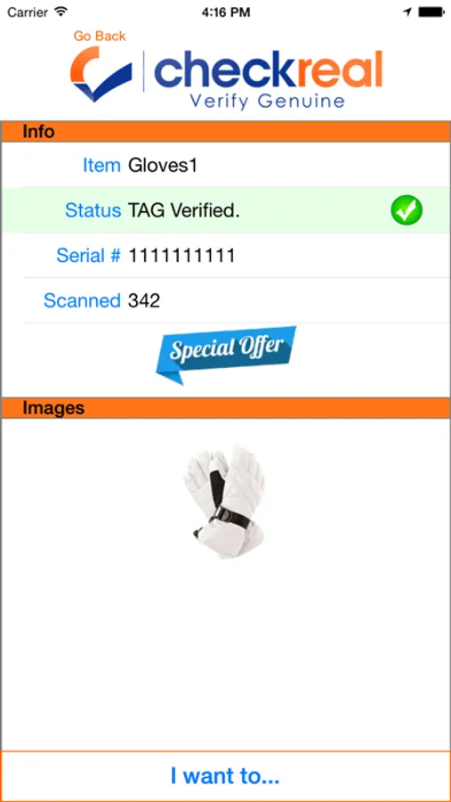 To use CheckReal, simply point the app towards a CheckReal tag found on selected products. the App will verify that the item is Genuine, including displaying what the item should look like and other product features.