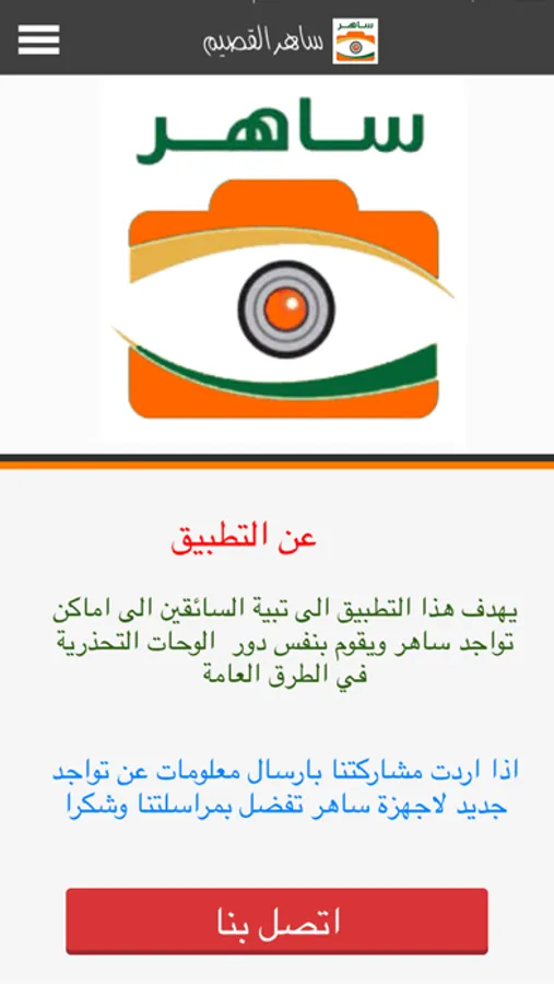 يهدف هذا التطبيق الى اعلام قائدي السيارات عن مكان تواجد ساهر سوا كان جهاز ساهر عند اشارة مرور او كبينة ثابتة اوسيارة متحركة مع امكانية عرضها في الخريطة دخل مدينة بريدة والمحافظات التابعة لها مثل محافظة عنيزة و المذنب والبكيرية والرس والمذنب وعيون الجواء والاسياح ورياض الخبراء وغيرها.