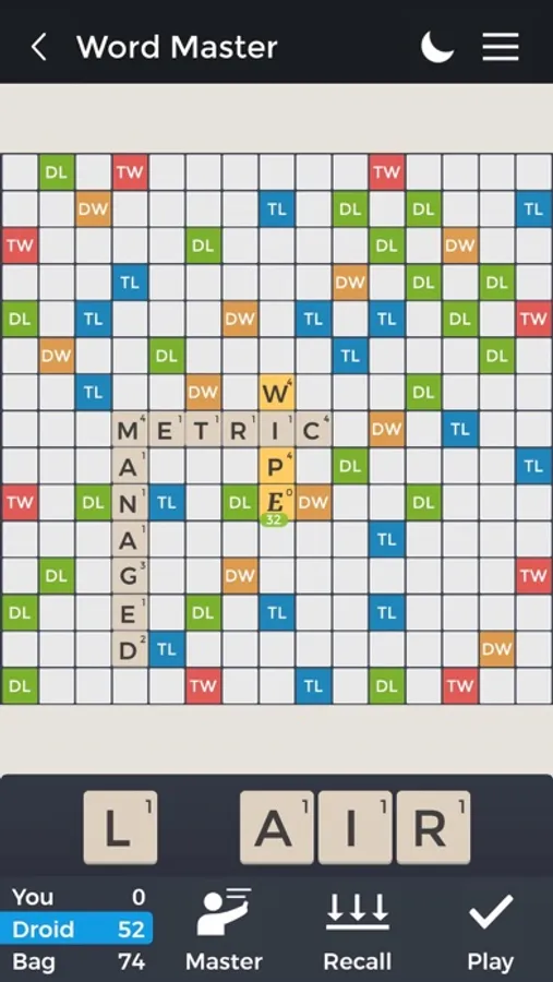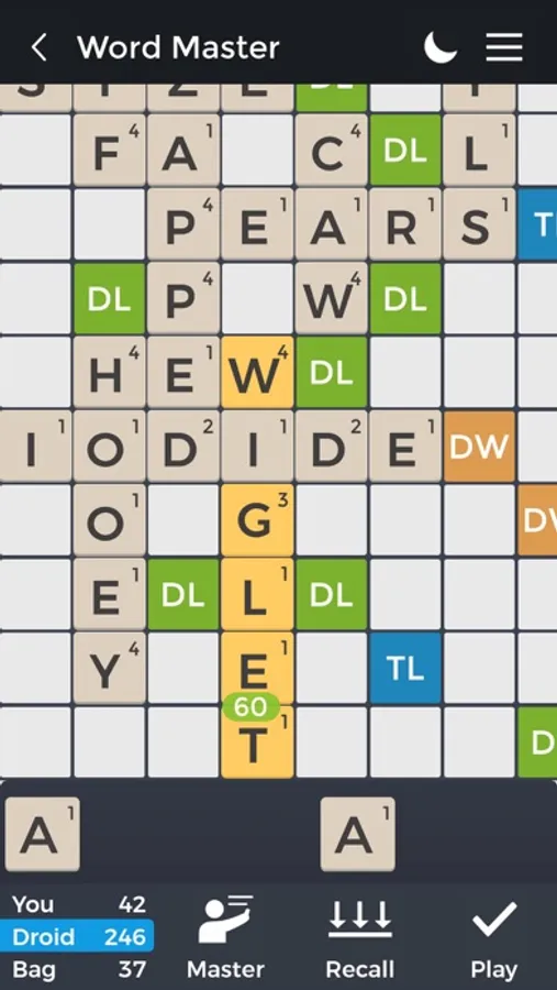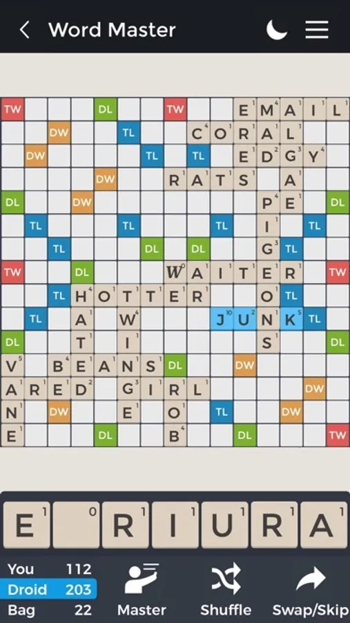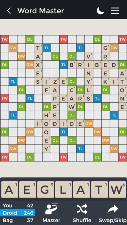 Create words with the 7 letters on your rack and place them on the 15 by 15 tile board. Boost your score by placing letters on the special Double Letter, Double Word, Triple Letter and Triple Word tiles.