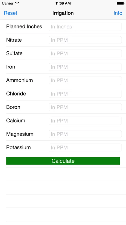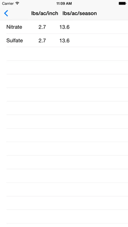 Irrigation water is never without minerals and nutrients. With the input of laboratory results and an expected seasonal irrigation by the user this app will provide an estimated amount of nutrients delivered with every acre in of water applied and total pounds per acre per season. These results can then be used to adjust fertilizer management plans and strategies. Nutrients included in this app are: Nitrate, Sulfate, Iron, Ammonium, Chloride, Boron, Calcium, Magnesium and Potassium.