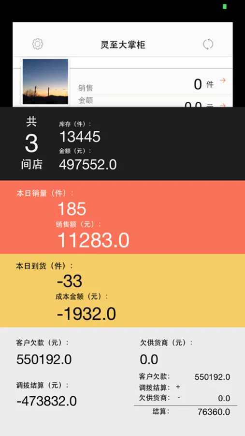 可以帮您同时管理多家店铺,一键获取所有信息,实时查看店铺的库存详情、销售订单、客户账目。让您无论何时何地,都能轻松掌握一切! 灵至大掌柜,您的随身管家。