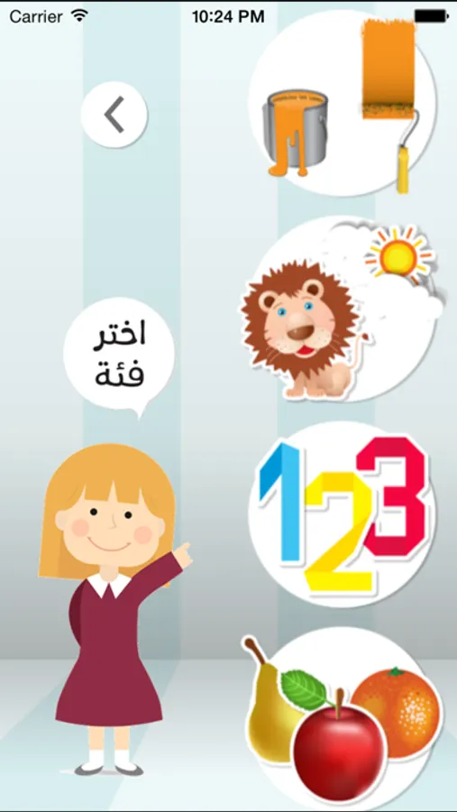 In the main screen, select from seven categories: colors, animals, numbers, food, furniture, nature, and transportation. The aim of the game is to arrange the letters in the correct order to make the word. All letters are pronounced when touched. When the word is correctly completed, the whole word is pronounced and the kid can start coloring the picture.
