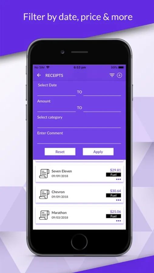 View expenses from any period, track how much you’ve spent on gas, meals, or any number of custom scenarios. Filter by category, name, date or any combination you choose - your accountant will love this!