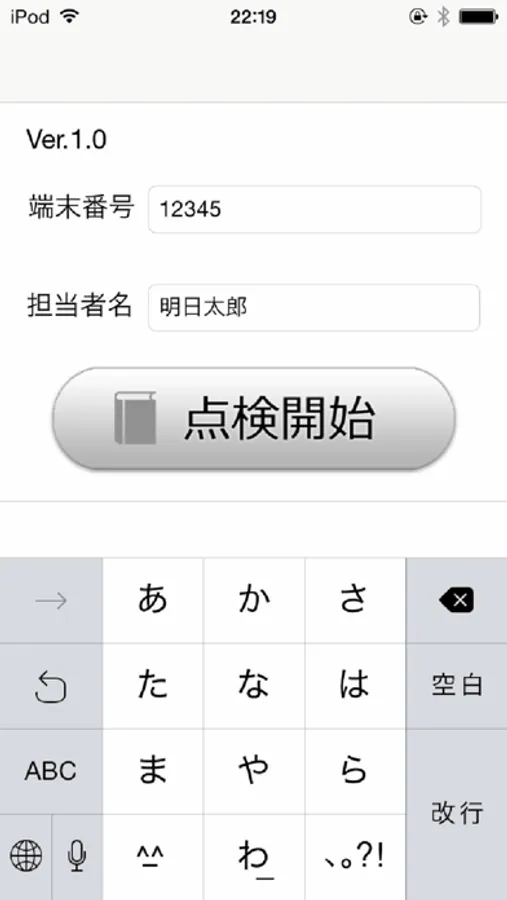 3. 端末番号と担当者名をキーボードで入力します。(2回目以降のアプリ起動時は前回入力した値が最初から表示されます。)ここで入力した端末番号と担当者名は出力したCSVファイルのファイル名に使用されます。