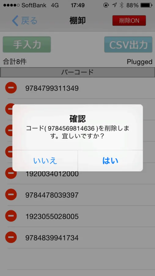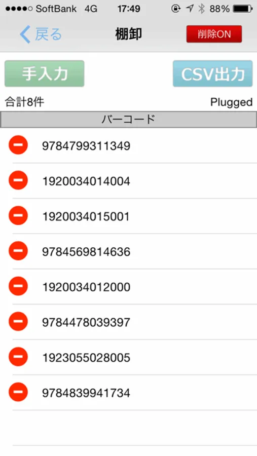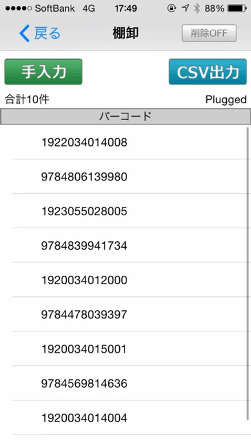 6. 全てのバーコードスキャンが終了したらCSV出力ボタンをタップします。端末内にスキャンされたバーコードデータをCSVファイルとして出力しTOP画面に戻ります。