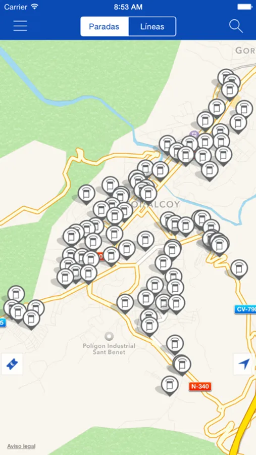 • PDI: Puntos de Interés de Alcoi, conectado con Google Places para mostrar información turística o de servicios; se puede visualizar junto con el mapa de paradas y líneas de bus.