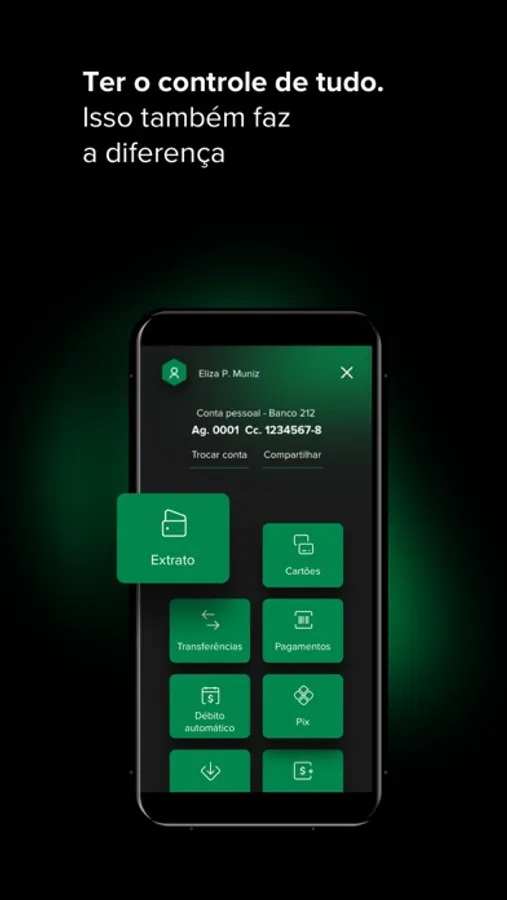 Controle sua conta digital onde e quando quiser. Consulte as transações do cartão de crédito e débito, faça transferências, consulte o saldo e extrato da conta e seus pontos para cashback.