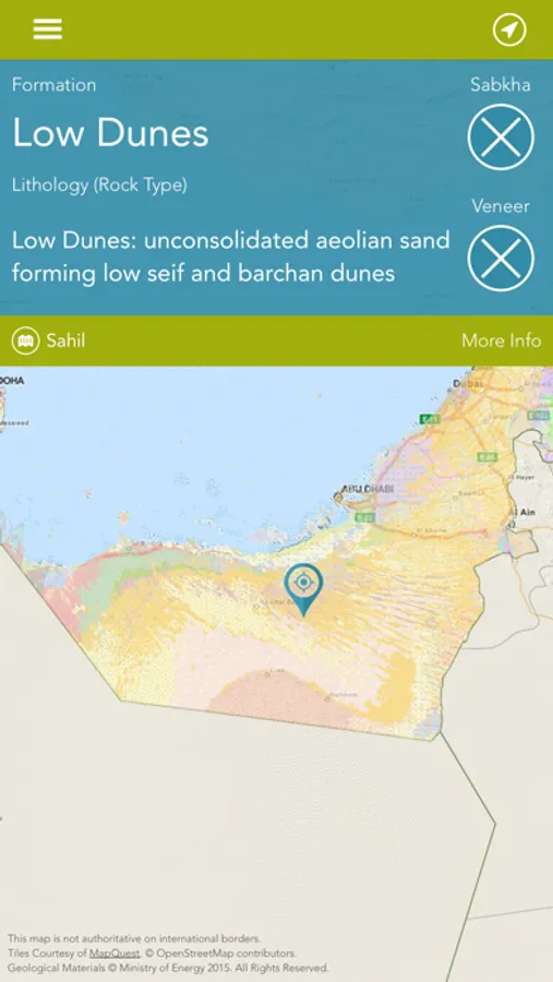 mGeology provides digital mapping for UAE surface geology. It also displays the presence of sabkha and veneer deposits. Geological cross sections, photographs and access to purchase a range of geology mapping products from the MOENR website are also provided.