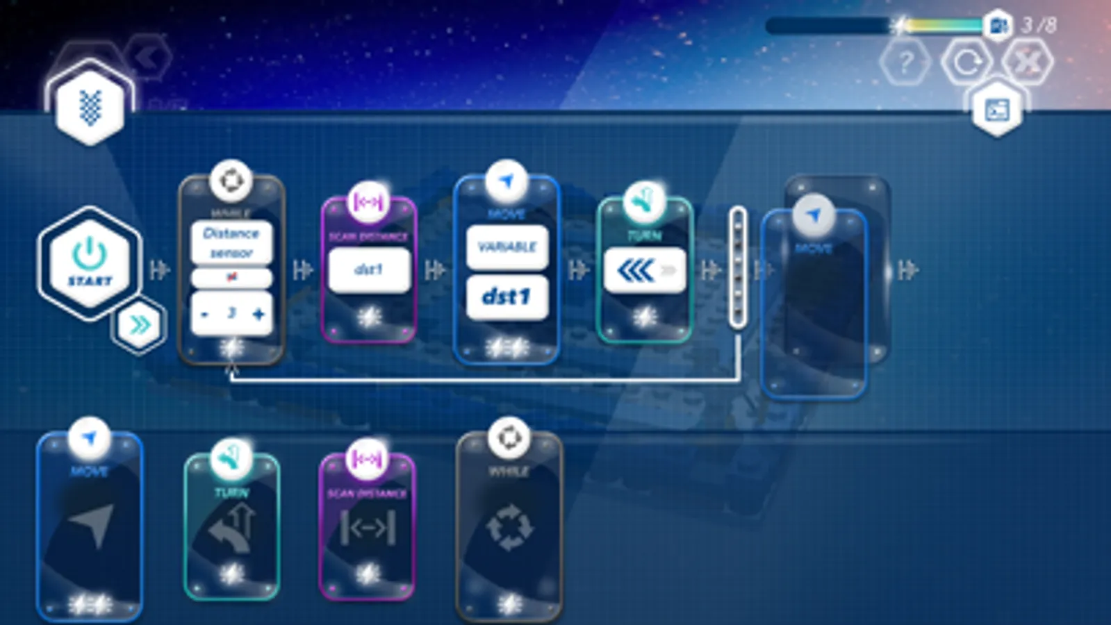 R-obbie the Robot crashed his spaceship in a far away galaxy. R-obbie needs a lot of energy to get back to his planet. Drag and drop programming instructions to help him reach the fuel he needs to return home safely.