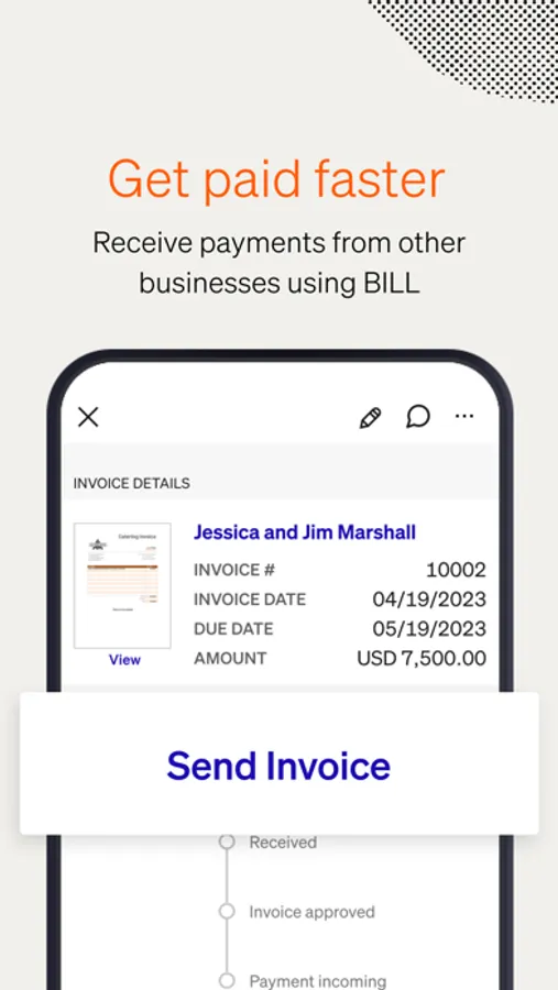 The BILL AP & AR app simplifies business payments and receivables for companies of all sizes. Whether you’re focused on accounts payable, accounts receivable, or just looking for an easy way to collect payments from a customer, BILL AP & AR streamlines tedious, manual processes—saving you 50% of the time spent paying and approving bills and helping you get paid 2x faster.