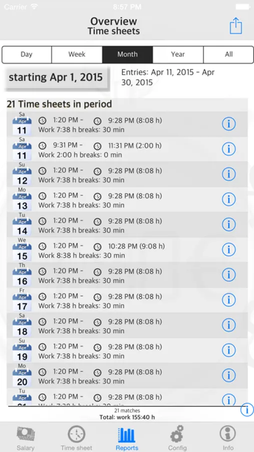 Generate reports on shifts for selected periods, to get an overview of the working time. The salary for that period is accumulated as well as the wage per hour is permanently calculated.