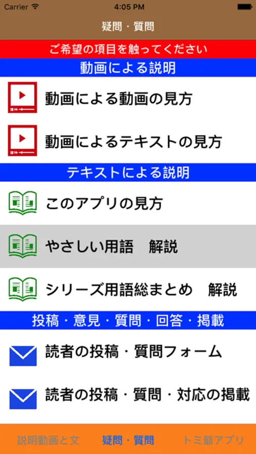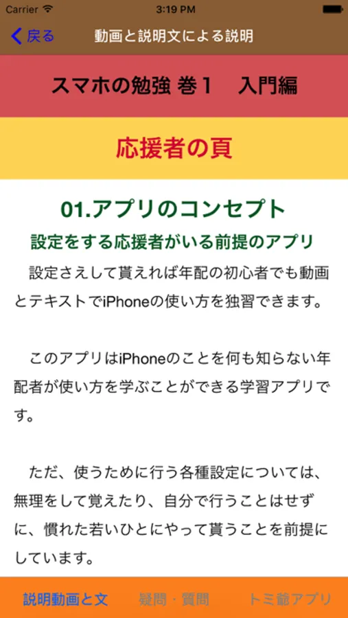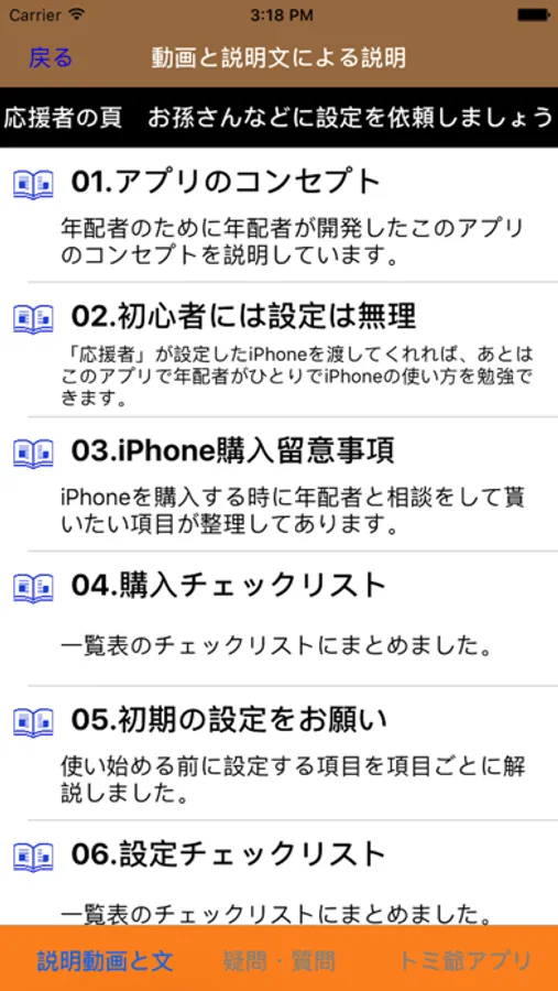 このアプリは年配の初心者を応援する息子や娘さんなどの応援者がiPhoneを準備する為のチェックリストと、初心者が操作方法を動画とテキストで学ぶためのものです。82歳の開発者が年配者の心理と希望を考慮して開発しました。