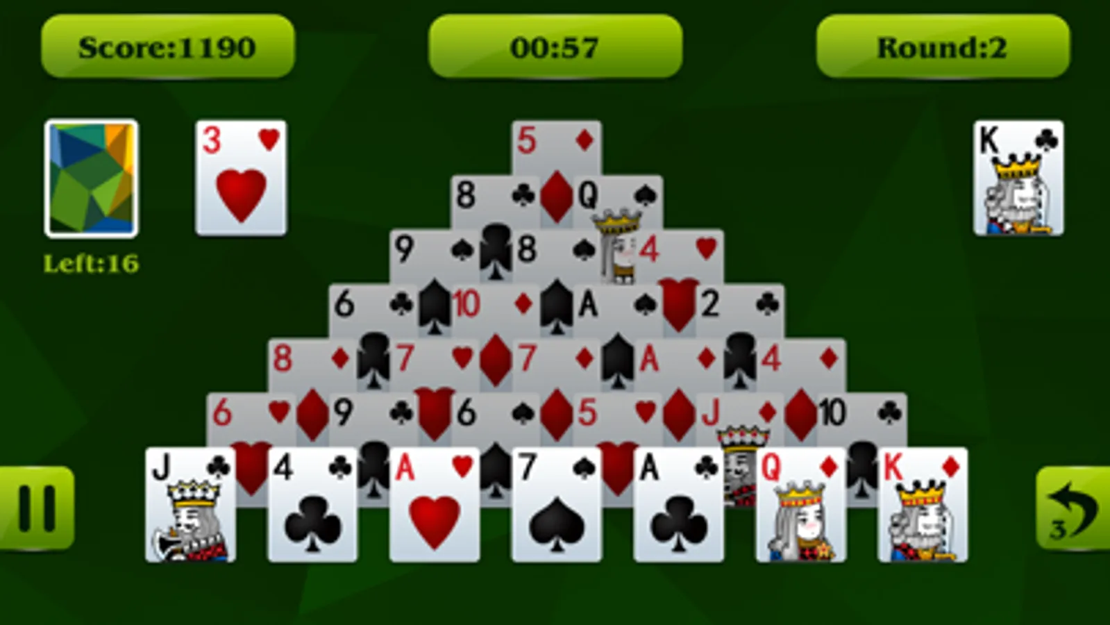 You need to match two cards as 13 to eliminate the cards. And there is a Pyramid which is full of cards. If you want to know how to play it, just try Alex Pyramid Solitaire.