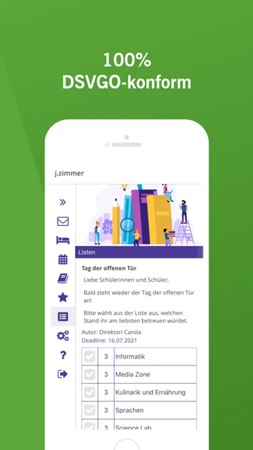 For Teachers and school administrators: quickly share and document information. Structure classes, invite parents to parent-teacher-days, neatly collect absences of students, and much more.