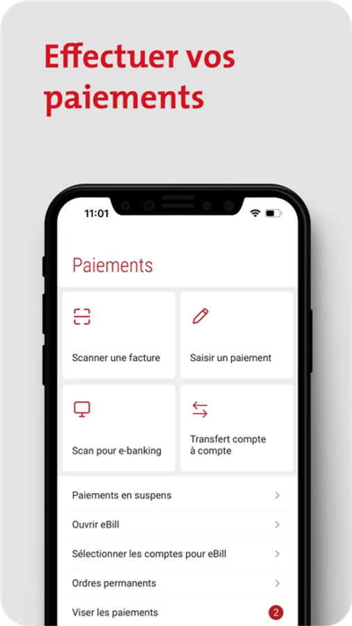 - Saisir vos paiements (paiement en Suisse uniquement, transfert de compte à compte, gérer les eBill)
