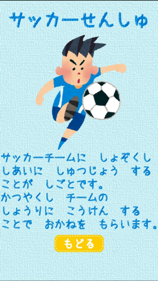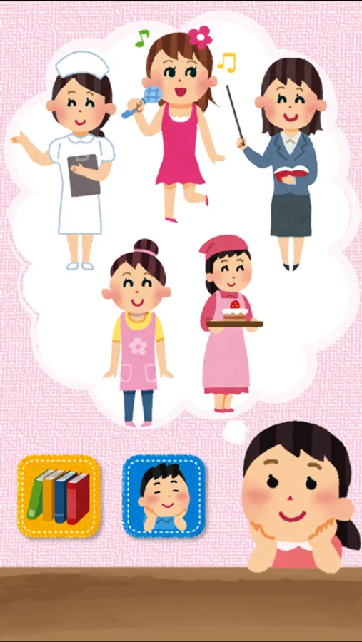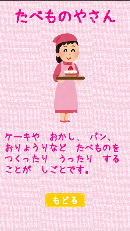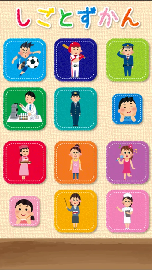 職業のイラストをタッチすると、おしゃべりしながらイラストが動いてお子さまを楽しませる知育アプリです。