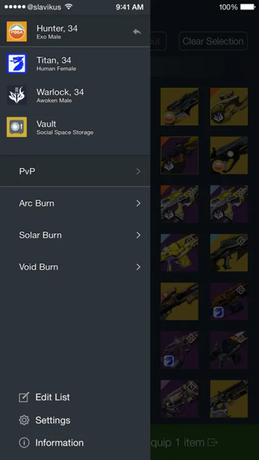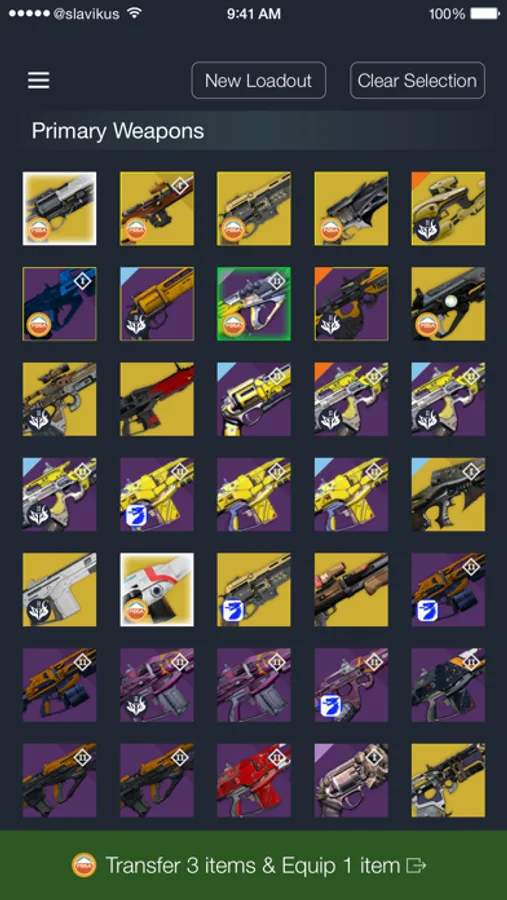 With its intelligent algorithm you don't have to worry which items are where — Loadouts will figure out what has to be moved, automatically offload extra items to the Vault if there's not enough slots available, take care of Exotic item equipping constraints and whatnot. Simply choose what you want on your character, push the Transfer button and there you go!