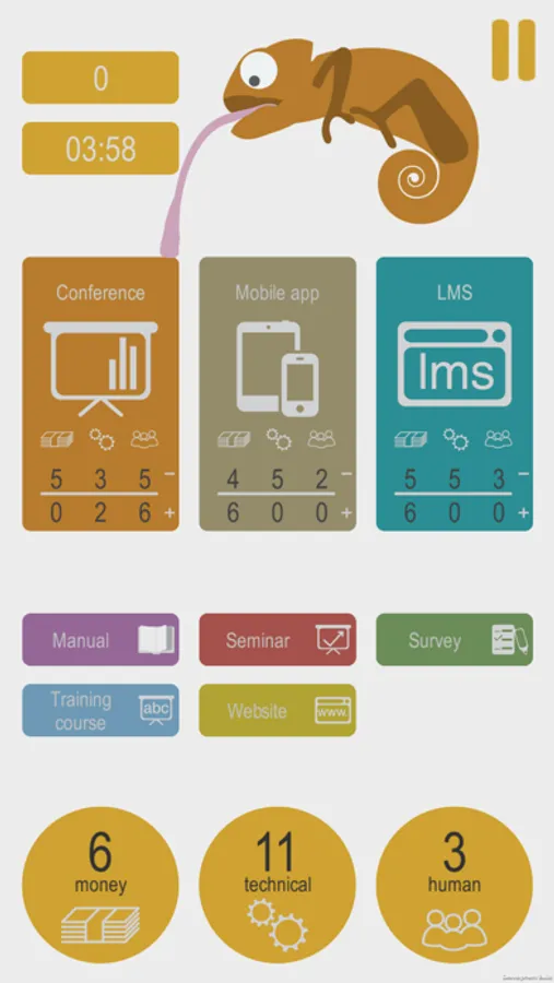 There are total eight events in the game - survey, conference, website, LMS (learning management system), manual, seminar, mobile app, training course. In order to start implementing your events you have three types of resources - financial, technical and human. Each new game starts with 10 financial, 14 technical and 7 human resources. All the time throughout the game you can see how much of each of those three types of resources you have left in the yellow circles at the bottom.
