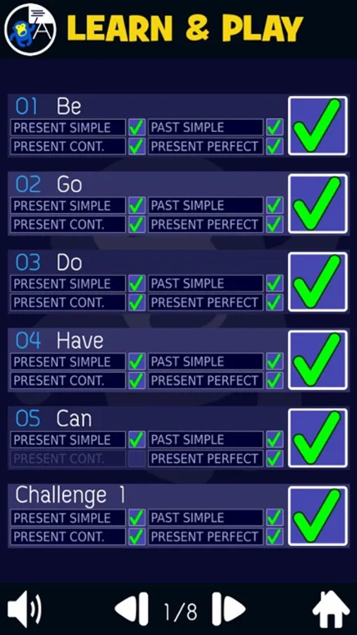 By playing this fun verb game you will learn the different conjugations (sometimes described as V1, V2, V3 and the gerund) of 120 of the most common regular and irregular English verbs. You will also learn the auxiliary verbs (“helping verbs”) that form correct English sentences.