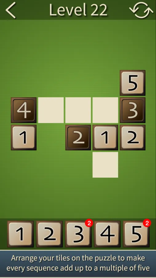 If you've played Five-O, you'll find the rules to be simple and familiar. Just arrange the given tiles on the blank spaces in the puzzle such that every sequence adds up to a multiple of five (5, 10, 15, etc.). The darker tiles are hints, fixed in place. It’s like a crossword puzzle of numbers!