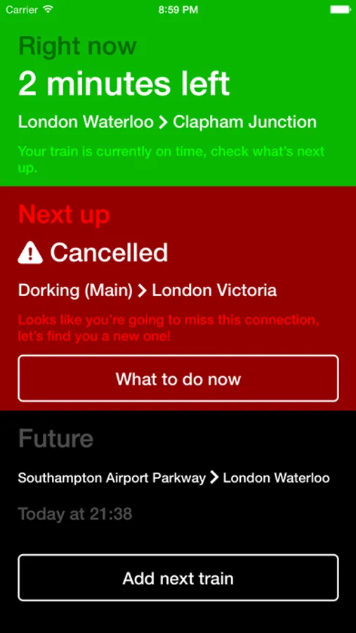 - Colour coded statuses for your trains. See with a glance whether or not your train is running on time.