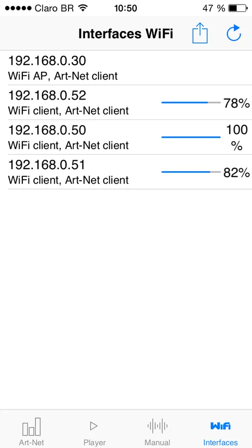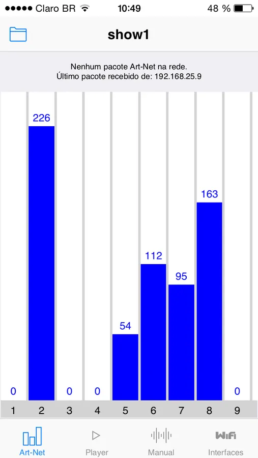 Caso exista um Art-Net Controller ativo na rede e se o modo Player ou Manual for selecionado no app, as luzes poderão piscar, pois no modo Player ou Manual o app funciona como um Art-Net Controller causando conflito com o outro Art-Net Controller já existente na rede.