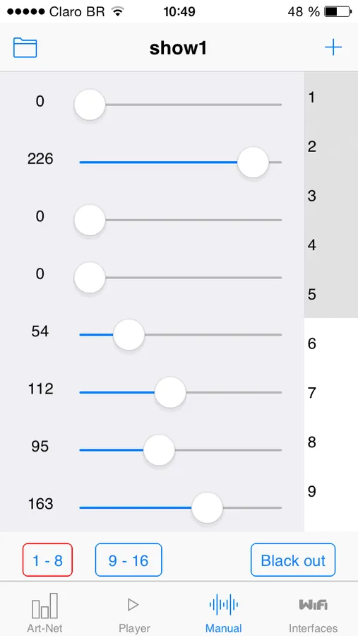 3) modo Manual: mostra 8 faders que, em conjunto com as páginas, permitem alterar manualmente o valor de 512 canais DMX, esses canais são enviados pela rede em pacotes ArtDmx no universo DMX 0;