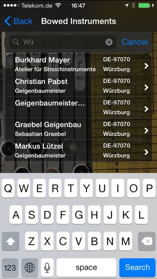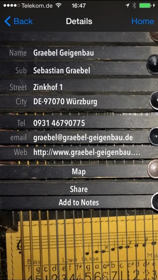 - In the detail view the telephone number can be dialled directly, a email can be send to the luthier/store and the internet link can be opened in a quick view or the default browser.