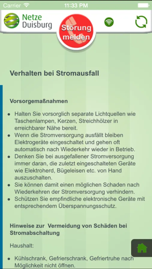 Für den Fall einer Störung sind Hinweise zum Vorgehen sowie zur Vorsorge enthalten. Für die schnelle Meldung einer Störung genügt das Antippen der Rufnummer für die allgemeine Störungsannahme oder der 24h Notfallnummer in dieser App.