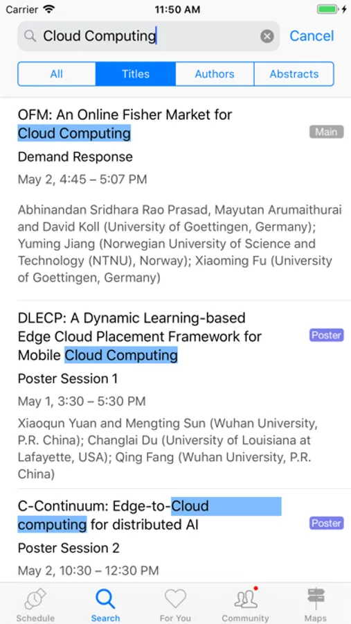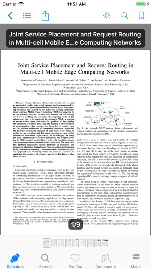 You can download, read, and export any of the papers in the entire INFOCOM proceedings — including all the workshops — right within the app. When viewing details related to a talk, scroll to the bottom and touch "Download Camera-Ready.” Better yet, once you have downloaded a paper, it will be cached for future offline reading, or for exporting. If you are using iOS 11 or above, you can also search for keywords in the paper.