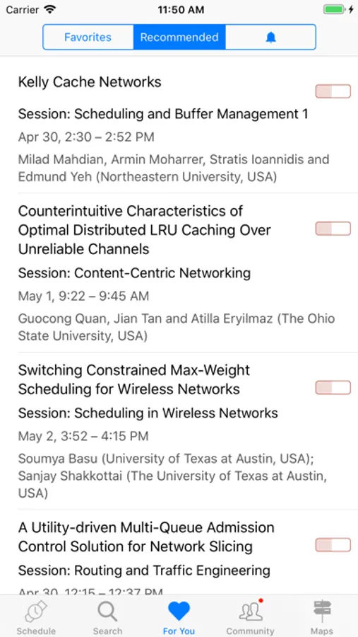 As a unique highlight, the app makes recommendations of similar talks based on your favorite talks in the main conference program. Recommendations are computed without connecting to the network, and they are based on full-text similarity evaluations using Latent Semantic Indexing.