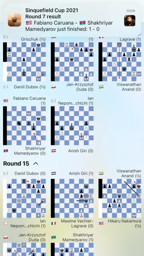 This is the *only* chess application that will provide you with live, up-to-the-minute notifications on all live chess action from top tournaments around the world.