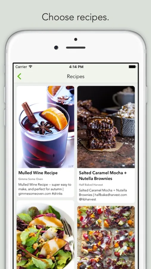 ‣ Select recipes: Import recipes from your favorite web sites using the built-in browser, recipes you've pinned on Pinterest or saved to your Evernote account, or from Safari with the BigNight share extension.