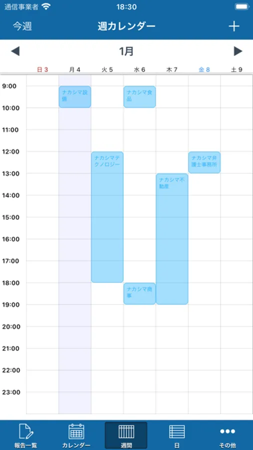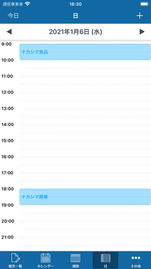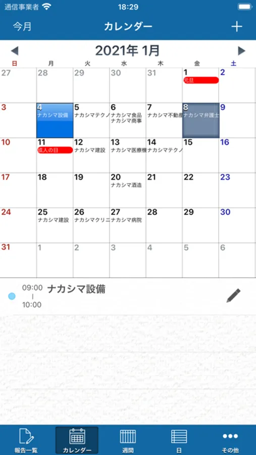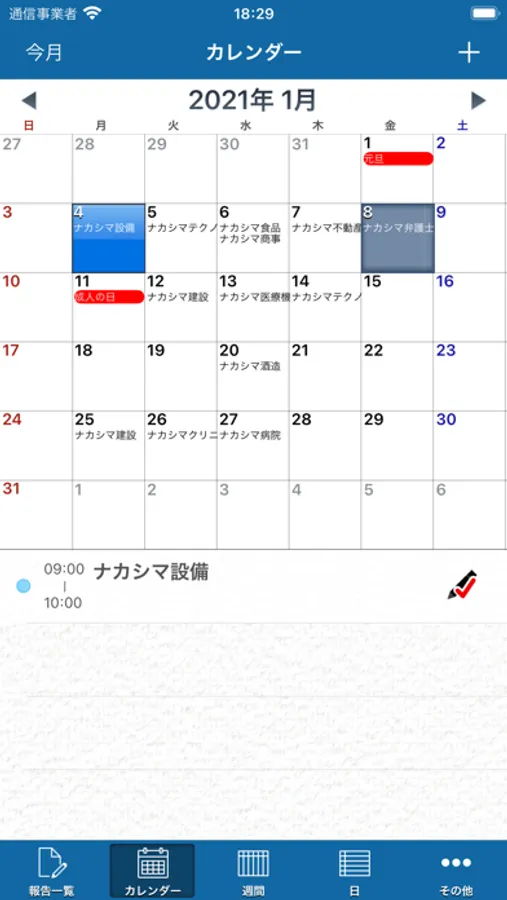 月・週・日単位でスケジュール管理が行えます。iOSカレンダーと同期できますので、営業活動以外の予定も把握できます。予定をタップして詳細の確認も可能です。