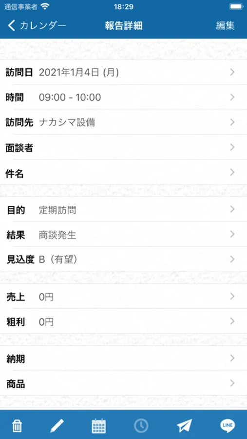 入力項目を選択する方式により、スピーディーに営業報告を作成できます。事前に登録されている選択項目は、自社用に自由に変更可能です。 また、前回の報告内容を引き継いで次回訪問時の営業報告を作成することもできますので、入力工数を大幅に削減できます。 報告には、写真や位置情報も登録可能ですので、店舗陳列状況を撮影して添付したり、点検業務にもご活用いただけます。 作成し営業報告はそのままメールで送信可能ですので、上司への報告や、メーリングリストを作成して複数人で情報を共有することも可能です。