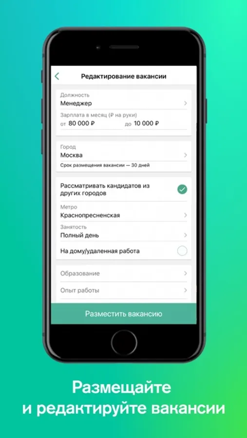• Работа с вакансиями: размещайте, публикуйте и редактируйте, отправляйте в архив, делитесь с коллегами, проверяйте статусы размещения, отслеживайте количество просмотров и откликов.