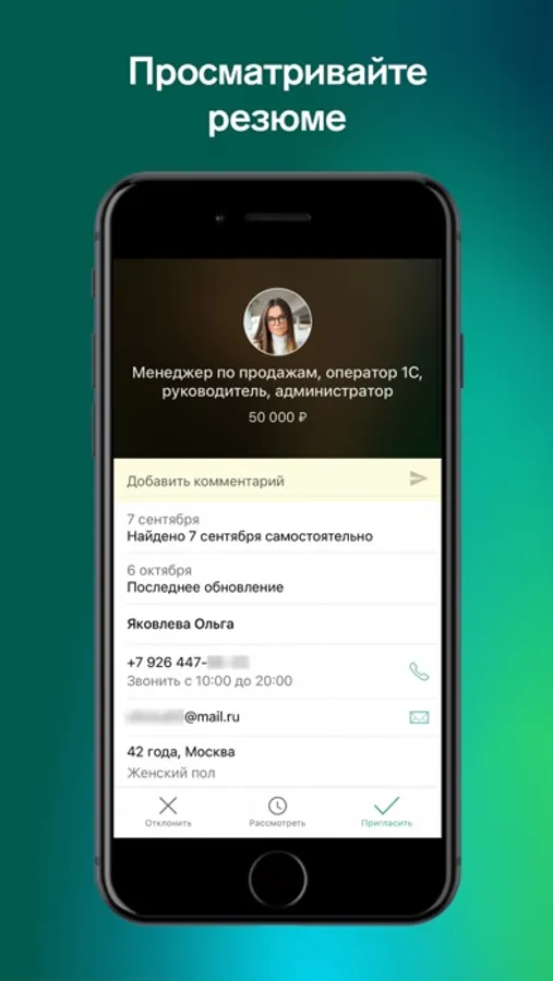 • Приглашение на собеседование: назначайте интервью лучшим претендентам. Писать и звонить кандидатам можно прямо из приложения.