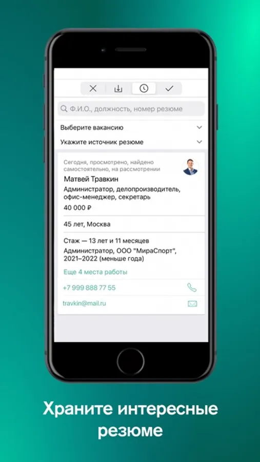 • Удобное хранение и мгновенная сортировка резюме: перемещайте их свайпами в сторону нужной папки.