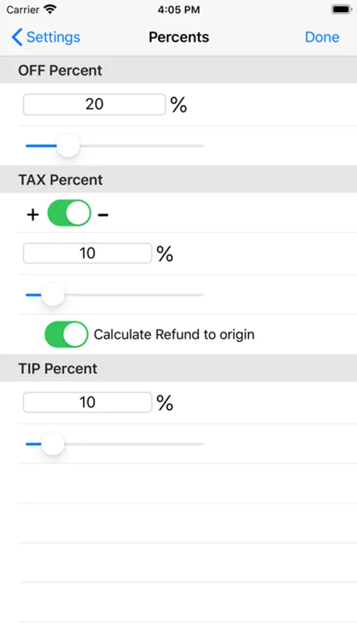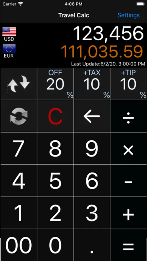 Provides OFF/TAX/TIP percent buttons to ease common calculations in the journey. TAX and TIP buttons even offer colorful state during operation.
