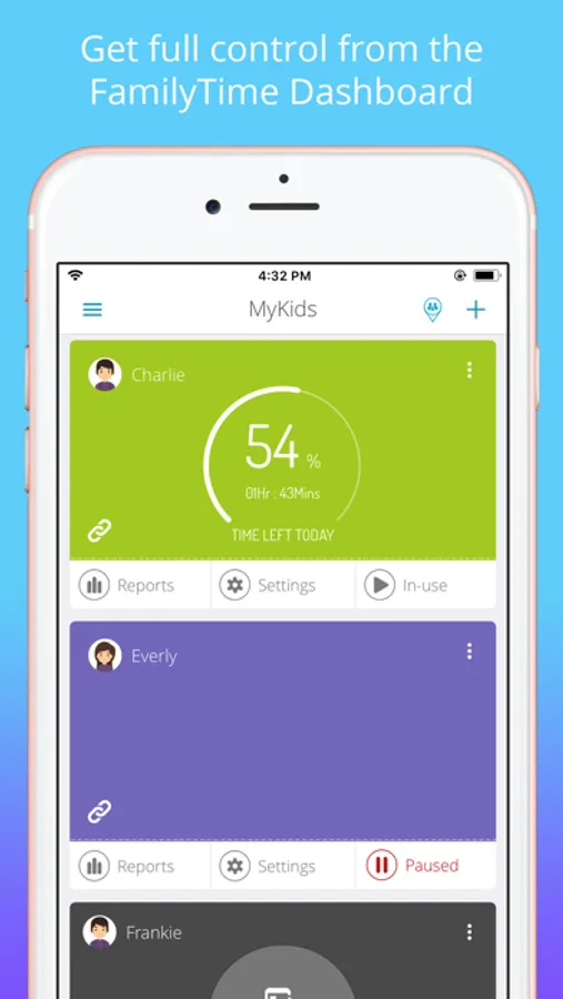 FamilyTime - Dashboard is a great way to organize and manage the child profiles you add to your FamilyTime Account. You can keep tabs on your kids at a single glance and can easily manage settings and parental controls for each child separately.