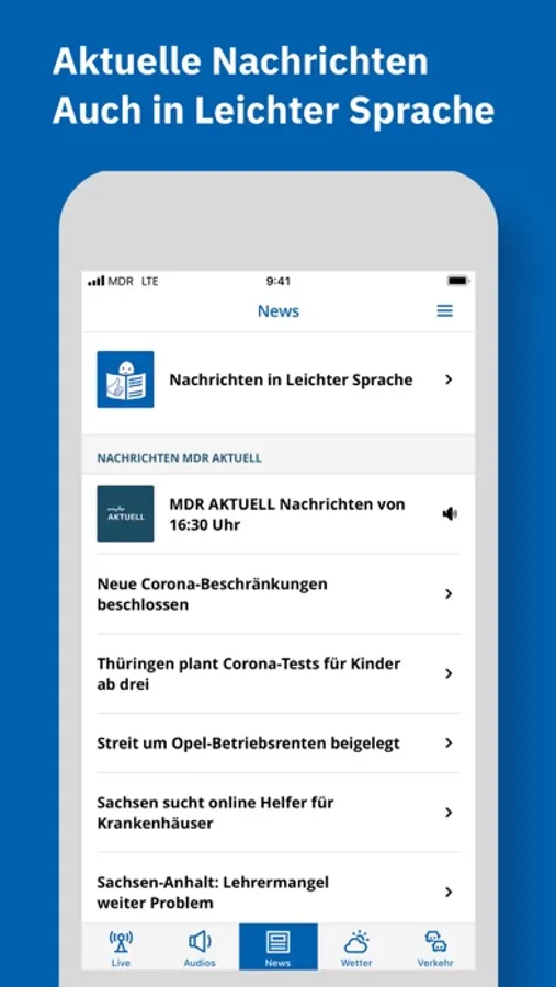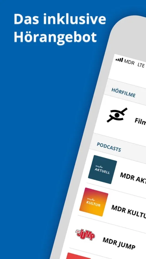 MDR Audio ist ein Teil des Telemedienangebotes des MITTELDEUTSCHEN RUNDFUNKS, des öffentlich-rechtlichen Senders für die deutschen Bundesländer Sachsen, Sachsen-Anhalt und Thüringen. Der MITTELDEUTSCHE RUNDFUNK ermöglicht mit barrierefreien Angeboten Menschen mit audiovisuellen Einschränkungen die Teilhabe am vielseitigen Programm des MDR. Die App „MDR Audio - Das inklusive Hörangebot“ ist dabei ein Baustein. Weitere Informationen finden Sie unter http://www.mdr.de/tv/barrierefreiheit/index.html