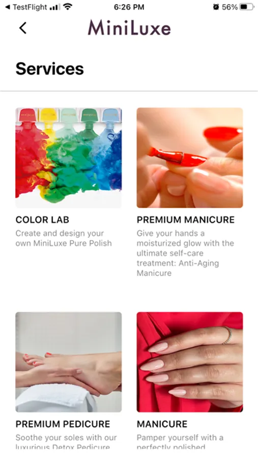 Book your next manicure, pedicure, or wax appointment instantly with the official MiniLuxe app. Sign in with your existing account details or make a new account and book some self-care time today. You can also view service details, see upcoming appointments, and add appointments to your calendar.