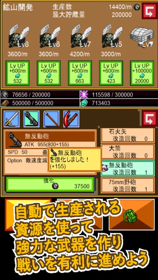 ・お金で施設を強化するとより資源が早く貯まります。