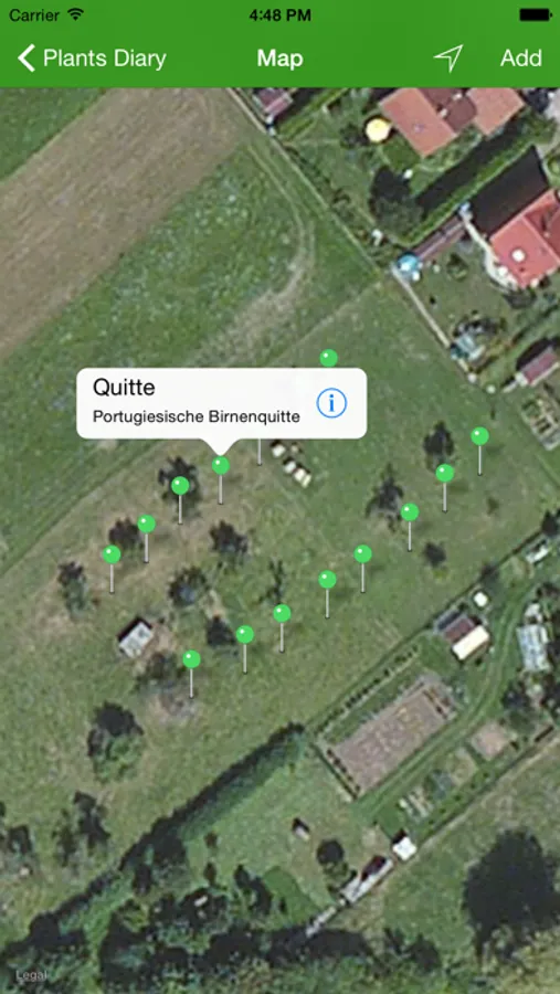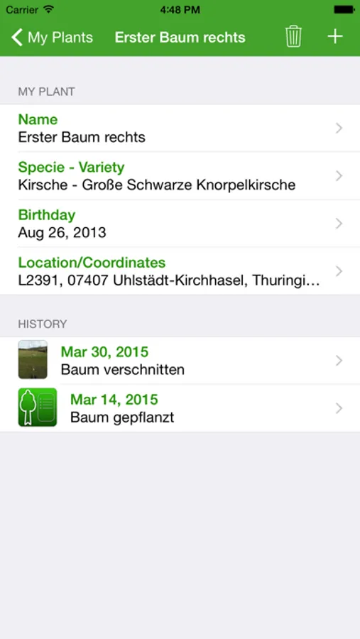- Create any number of own plants/trees. This can be done directly on the visual map, among other things very easy, for example, if you walk through your orchard. The place can be corrected afterwards by moving the pins with the finger. Each plant can be given an "birthday" and an individual name.