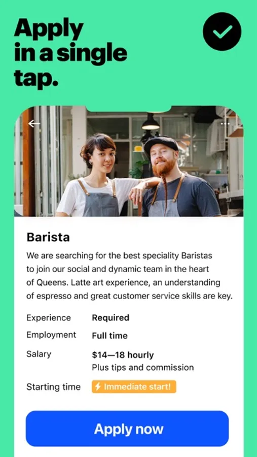 Get a job in 24 hours! JOB TODAY is the #1 app for jobs in restaurants, shops and more. We’re revolutionizing the way employers hire staff and candidates find jobs. That’s why JOB TODAY was featured on CNBC, The Telegraph, Bloomberg, and many other media outlets. Pretty cool right?